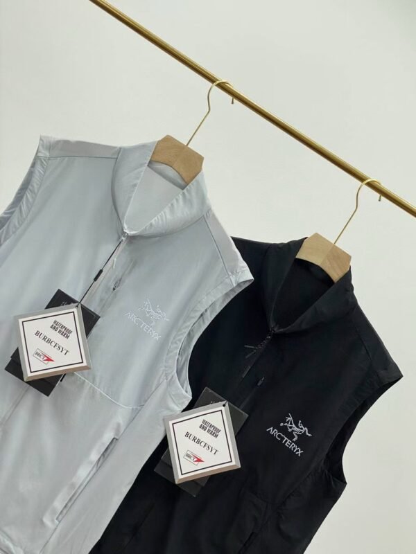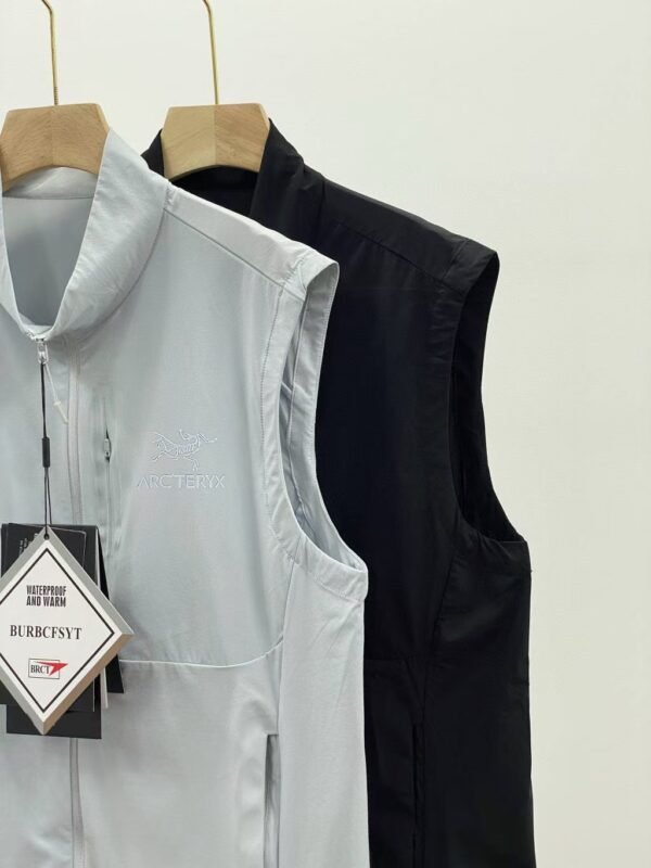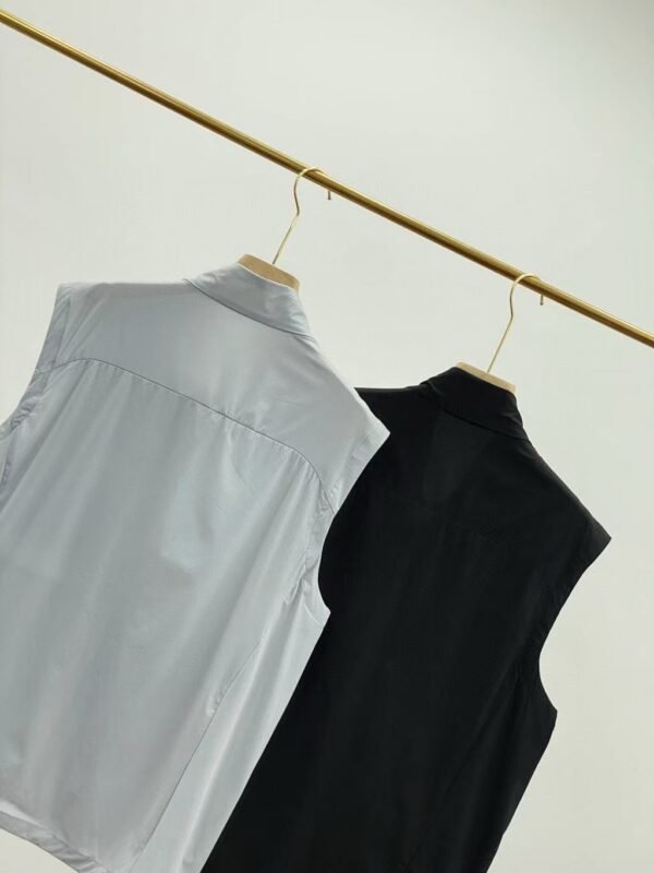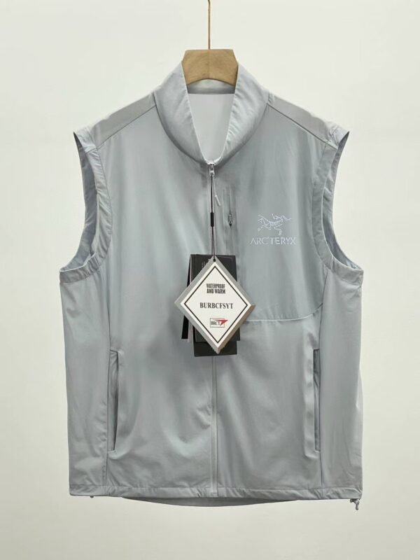 Sleeveless vest with zipper closure and stand-up collar.